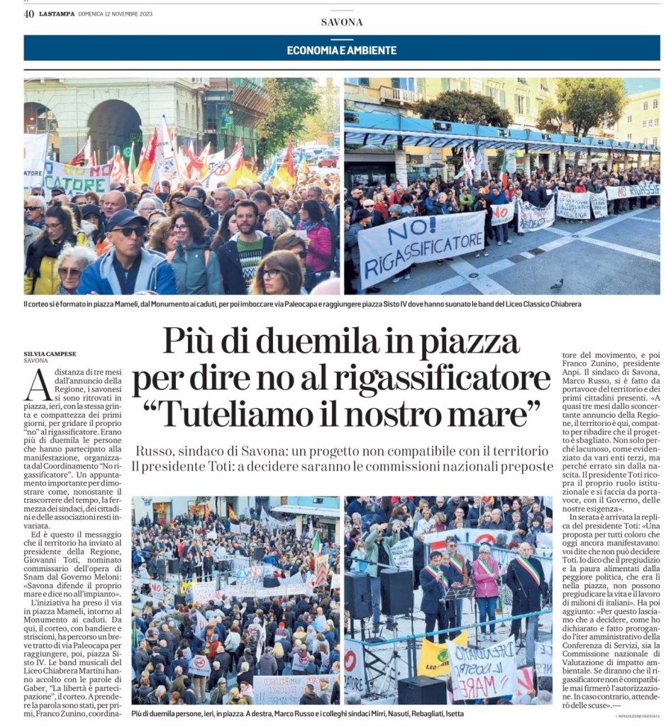 Ed è questo il messaggio che il territorio ha inviato al presidente della Regione, Giovanni Toti, nominato commissario dell’opera di Snam dal Governo Meloni: «Savona difende il proprio mare e dice no all’impianto».