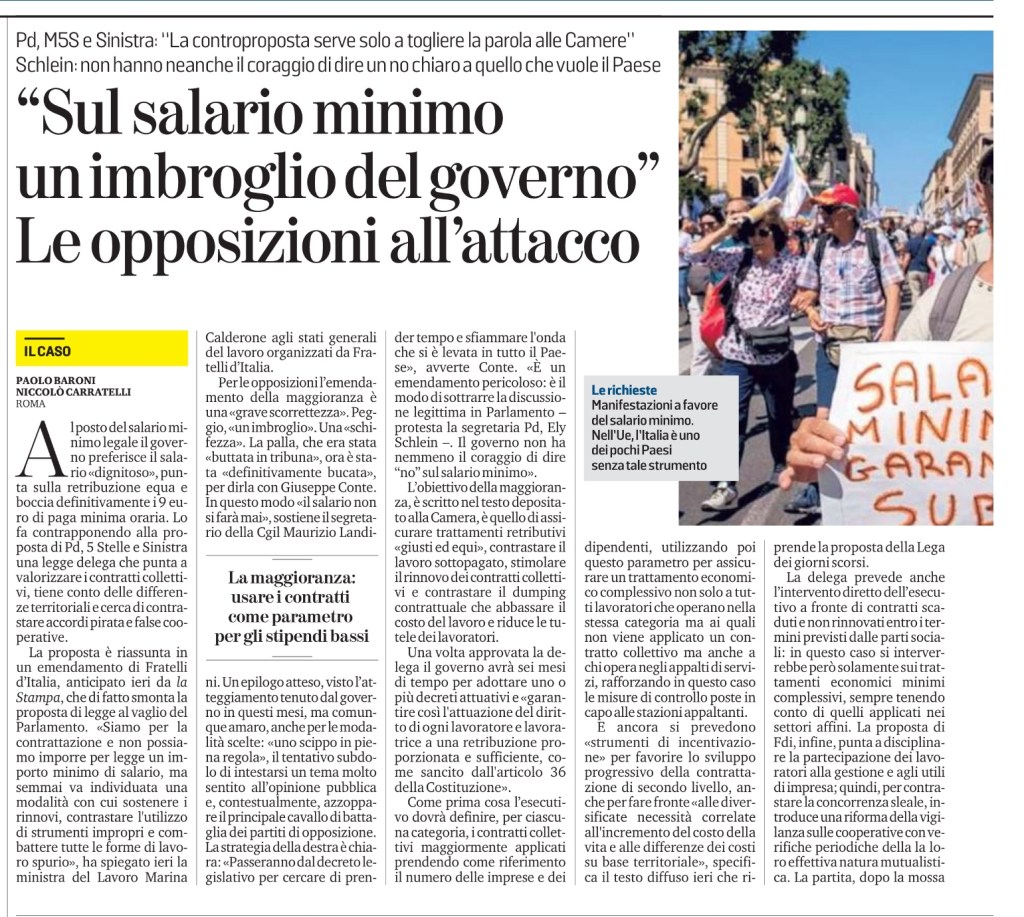 Per le opposizioni l’emendamento della maggioranza è una «grave scorrettezza». Peggio, «un imbroglio». Una «schifezza». La palla, che era stata «buttata in tribuna», ora è stata «definitivamente bucata», per dirla con Giuseppe Conte. In questo modo «il salario non si farà mai», sostiene il segretario della Cgil Maurizio Landini. Un epilogo atteso, visto l’atteggiamento tenuto dal governo in questi mesi, ma comunque amaro, anche per le modalità scelte: «uno scippo in piena regola», il tentativo subdolo di intestarsi un tema molto sentito all’opinione pubblica e, contestualmente, azzoppare il principale cavallo di battaglia dei partiti di opposizione. La strategia della destra è chiara: «Passeranno dal decreto legislativo per cercare di prender tempo e sfiammare l’onda che si è levata in tutto il Paese», avverte Conte. «È un emendamento pericoloso: è il modo di sottrarre la discussione legittima in Parlamento – protesta la segretaria Pd, Ely Schlein –. Il governo non ha nemmeno il coraggio di dire “no” sul salario minimo».