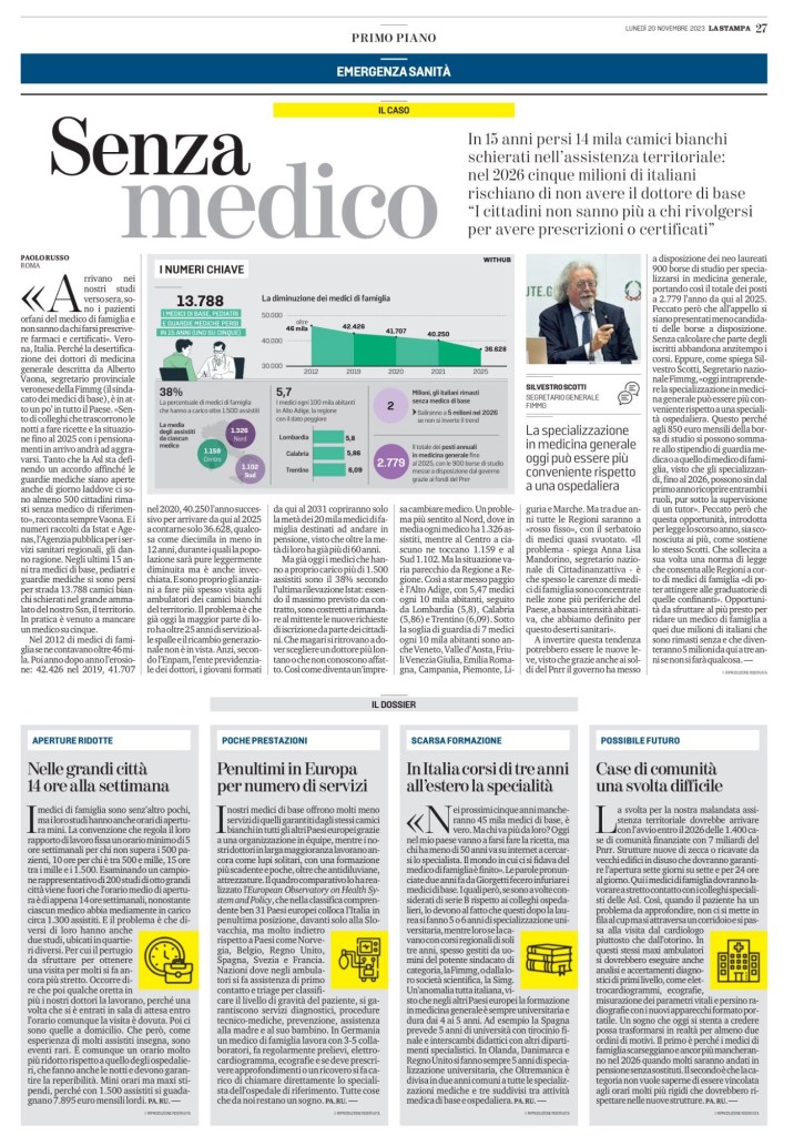 «Arrivano nei nostri studi verso sera, sono i pazienti orfani del medico di famiglia e non sanno da chi farsi prescrivere farmaci e certificati». Verona, Italia. Perché la desertificazione dei dottori di medicina generale descritta da Alberto Vaona, segretario provinciale veronese della Fimmg (il sindacato dei medici di base), è in atto un po’ in tutto il Paese. «Sento di colleghi che trascorrono le notti a fare ricette e la situazione fino al 2025 con i pensionamenti in arrivo andrà ad aggravarsi. Tanto che la Asl sta definendo un accordo affinché le guardie mediche siano aperte anche di giorno laddove ci sono almeno 500 cittadini rimasti senza medico di riferimento», racconta sempre Vaona. E i numeri raccolti da Istat e Agenas, l’Agenzia pubblica per i servizi sanitari regionali, gli danno ragione. Negli ultimi 15 anni tra medici di base, pediatri e guardie mediche si sono persi per strada 13.788 camici bianchi schierati nel grande ammalato del nostro Ssn, il territorio. In pratica è venuto a mancare un medico su cinque.