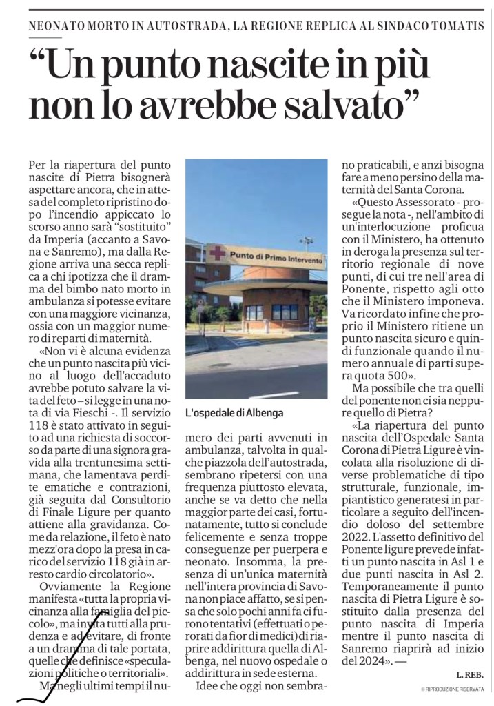 Per la riapertura del punto nascite di Pietra bisognerà aspettare ancora, che in attesa del completo ripristino dopo l’incendio appiccato lo scorso anno sarà “sostituito” da Imperia (accanto a Savona e Sanremo), ma dalla Regione arriva una secca replica a chi ipotizza che il dramma del bimbo nato morto in ambulanza si potesse evitare con una maggiore vicinanza, ossia con un maggior numero di reparti di maternità.