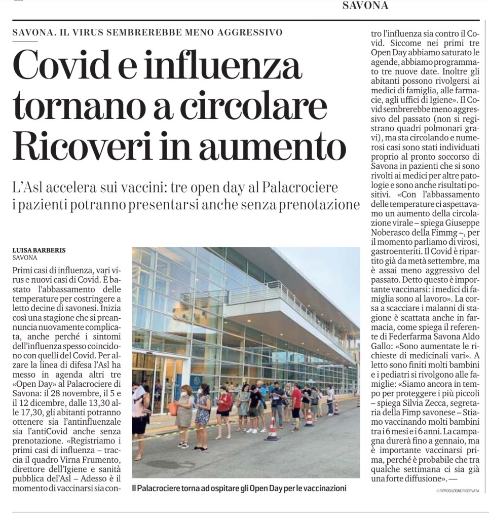 Primi casi di influenza, vari virus e nuovi casi di Covid. È bastato l’abbassamento delle temperature per costringere a letto decine di savonesi. Inizia così una stagione che si preannuncia nuovamente complicata, anche perché i sintomi dell’influenza spesso coincidono con quelli del Covid. Per alzare la linea di difesa l’Asl ha messo in agenda altri tre «Open Day» al Palacrociere di Savona: il 28 novembre, il 5 e il 12 dicembre, dalle 13,30 alle 17,30, gli abitanti potranno ottenere sia l’antinfluenzale sia l’antiCovid anche senza prenotazione. «Registriamo i primi casi di influenza – traccia il quadro Virna Frumento, direttore dell’Igiene e sanità pubblica del’Asl – Adesso è il momento di vaccinarsi sia contro l’influenza sia contro il Covid. Siccome nei primi tre Open Day abbiamo saturato le agende, abbiamo programmato tre nuove date. Inoltre gli abitanti possono rivolgersi ai medici di famiglia, alle farmacie, agli uffici di Igiene». Il Covid sembrerebbe meno aggressivo del passato (non si registrano quadri polmonari gravi), ma sta circolando e numerosi casi sono stati individuati proprio al pronto soccorso di Savona in pazienti che si sono rivolti ai medici per altre patologie e sono anche risultati positivi. «Con l’abbassamento delle temperature ci aspettavamo un aumento della circolazione virale – spiega Giuseppe Noberasco della Fimmg –, per il momento parliamo di virosi, gastroenteriti. Il Covid è ripartito già da metà settembre, ma è assai meno aggressivo del passato. Detto questo è importante vaccinarsi: i medici di famiglia sono al lavoro». La corsa a scacciare i malanni di stagione è scattata anche in farmacia, come spiega il referente di Federfarma Savona Aldo Gallo: «Sono aumentate le richieste di medicinali vari». A letto sono finiti molti bambini e i pediatri si rivolgono alle famiglie: «Siamo ancora in tempo per proteggere i più piccoli – spiega Silvia Zecca, segretaria della Fimp savonese – Stiamo vaccinando molti bambini tra i 6 mesi e i 6 anni. La campagna durerà fino a gennaio, ma è importante vaccinarsi prima, perché è probabile che tra qualche settimana ci sia già una forte diffusione».