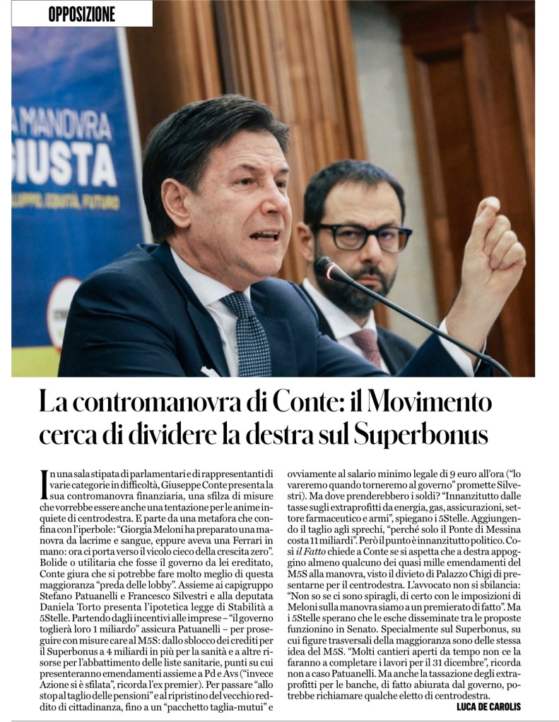 In una sala stipata di parlamentari e di rappresentanti di varie categorie in difficoltà, Giuseppe Conte presenta la sua contromanovra finanziaria, una sfilza di misure che vorrebbe essere anche una tentazione per le anime inquiete di centrodestra. E parte da una metafora che confina con l’iperbole: “Giorgia Meloni ha preparato una manovra da lacrime e sangue, eppure aveva una Ferrari in mano: ora ci porta verso il vicolo cieco della crescita zero”. Bolide o utilitaria che fosse il governo da lei ereditato, Conte giura che si potrebbe fare molto meglio di questa maggioranza “preda delle lobby”. Assieme ai capigruppo Stefano Patuanelli e Francesco Silvestri e alla deputata Daniela Torto presenta l’ipotetica legge di Stabilità a 5Stelle. Partendo dagli incentivi alle imprese – “il governo toglierà loro 1 miliardo” assicura Patuanelli – per proseguire con misure care al M5S: dallo sblocco dei crediti per il Superbonus a 4 miliardi in più per la sanità e a altre risorse per l’abbattimento delle liste sanitarie, punti su cui presenteranno emendamenti assieme a Pd e Avs (“invece Azione si è sfilata”, ricorda l’ex premier). Per passare “allo stop al taglio delle pensioni” e al ripristino del vecchio reddito di cittadinanza, fino a un “pacchetto taglia-mutui” e ovviamente al salario minimo legale di 9 euro all’ora (“lo vareremo quando torneremo al governo” promette Silvestri). Ma dove prenderebbero i soldi? “Innanzitutto dalle tasse sugli extraprofitti da energia, gas, assicurazioni, settore farmaceutico e armi”, spiegano i 5Stelle. Aggiungendo il taglio agli sprechi, “perché solo il Ponte di Messina costa 11 miliardi”. Però il punto è innanzitutto politico. Così il Fatto chiede a Conte se si aspetta che a destra appoggino almeno qualcuno dei quasi mille emendamenti del M5S alla manovra, visto il divieto di Palazzo Chigi di presentarne per il centrodestra. L’avvocato non si sbilancia: “Non so se ci sono spiragli, di certo con le imposizioni di Meloni sulla manovra siamo a un premierato di fatto”. Ma i 5Stelle sperano che le esche disseminate tra le proposte funzionino in Senato. Specialmente sul Superbonus, su cui figure trasversali della maggioranza sono delle stessa idea del M5S. “Molti cantieri aperti da tempo non ce la faranno a completare i lavori per il 31 dicembre”, ricorda non a caso Patuanelli. Ma anche la tassazione degli extraprofitti per le banche, di fatto abiurata dal governo, potrebbe richiamare qualche eletto di centrodestra.
