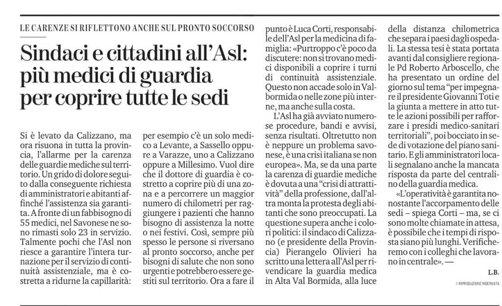 L’Asl ha già avviato numerose procedure, bandi e avvisi, senza risultati. Oltretutto non è neppure un problema savonese, è una crisi italiana se non europea». Ma, se da una parte la carenza di guardie mediche è dovuta a una “crisi di attrattività” della professione, dall’altra monta la protesta degli abitanti che sono preoccupati. La questione supera anche i colori politici: il sindaco di Calizzano (e presidente della Provincia) Pierangelo Olivieri ha scritto una lettera all’Asl per rivendicare la guardia medica in Alta Val Bormida, alla luce della distanza chilometrica che separa i paesi dagli ospedali. La stessa tesi è stata portata avanti dal consigliere regionale Pd Roberto Arboscello, che ha presentato un ordine del giorno sul tema “per impegnare il presidente Giovanni Toti e la giunta a mettere in atto tutte le azioni possibili per rafforzare i presidi medico-sanitari territoriali”, poi bocciato in sede di votazione del piano sanitario. E gli amministratori locali segnalano anche la mancata risposta da parte del centralino della guardia medica.