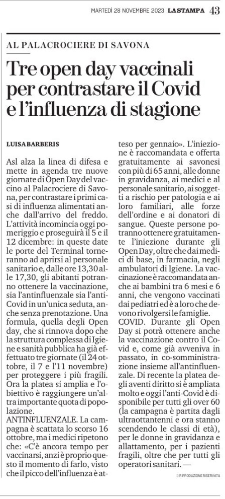 Asl alza la linea di difesa e mette in agenda tre nuove giornate di Open Day del vaccino al Palacrociere di Savona, per contrastare i primi casi di influenza alimentati anche dall’arrivo del freddo. L’attività incomincia oggi pomeriggio e proseguirà il 5 e il 12 dicembre: in queste date le porte del Terminal torneranno ad aprirsi al personale sanitario e, dalle ore 13,30 alle 17,30, gli abitanti potranno ottenere la vaccinazione, sia l’antinfluenzale sia l’antiCovid in un’unica seduta, anche senza prenotazione. Una formula, quella degli Open day, che si rinnova dopo che la struttura complessa di Igiene e sanità pubblica ha già effettuato tre giornate (il 24 ottobre, il 7 e l’11 novembre) per proteggere i più fragili. Ora la platea si amplia e l’obiettivo è raggiungere un’altra importante quota di popolazione.