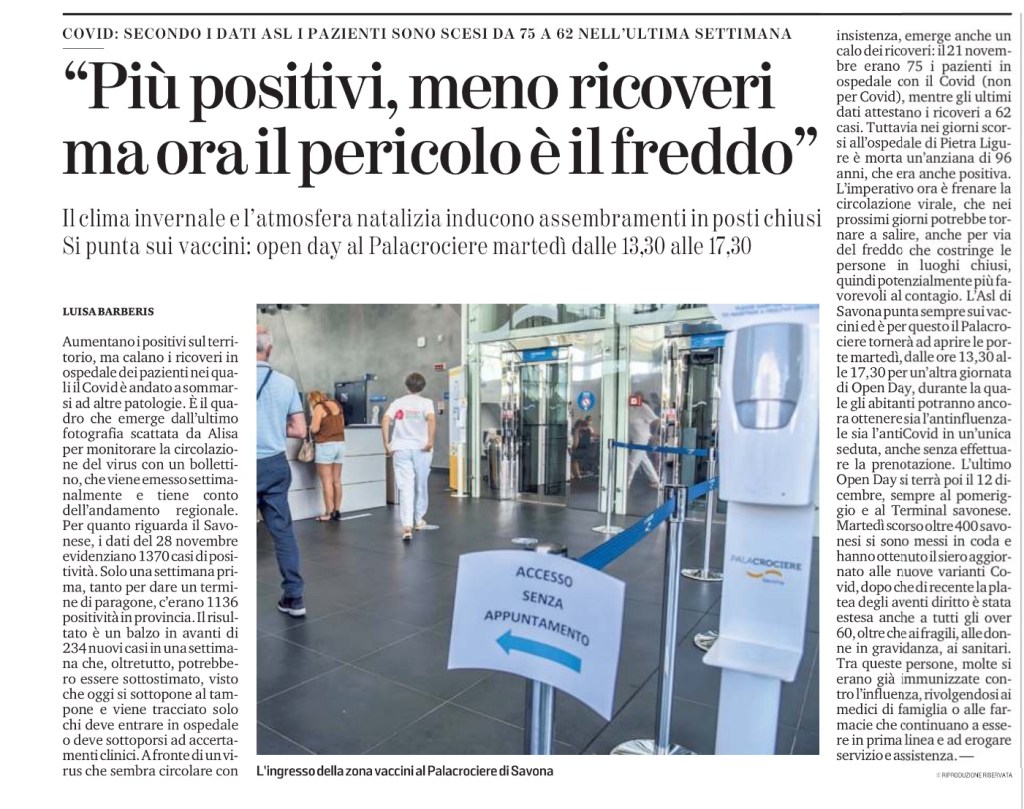 Aumentano i positivi sul territorio, ma calano i ricoveri in ospedale dei pazienti nei quali il Covid è andato a sommarsi ad altre patologie. È il quadro che emerge dall’ultimo fotografia scattata da Alisa per monitorare la circolazione del virus con un bollettino, che viene emesso settimanalmente e tiene conto dell’andamento regionale. Per quanto riguarda il Savonese, i dati del 28 novembre evidenziano 1370 casi di positività. Solo una settimana prima, tanto per dare un termine di paragone, c’erano 1136 positività in provincia. Il risultato è un balzo in avanti di 234 nuovi casi in una settimana che, oltretutto, potrebbero essere sottostimato, visto che oggi si sottopone al tampone e viene tracciato solo chi deve entrare in ospedale o deve sottoporsi ad accertamenti clinici. A fronte di un virus che sembra circolare con insistenza, emerge anche un calo dei ricoveri: il 21 novembre erano 75 i pazienti in ospedale con il Covid (non per Covid), mentre gli ultimi dati attestano i ricoveri a 62 casi. Tuttavia nei giorni scorsi all’ospedale di Pietra Ligure è morta un’anziana di 96 anni, che era anche positiva. L’imperativo ora è frenare la circolazione virale, che nei prossimi giorni potrebbe tornare a salire, anche per via del freddo che costringe le persone in luoghi chiusi, quindi potenzialmente più favorevoli al contagio. L’Asl di Savona punta sempre sui vaccini ed è per questo il Palacrociere tornerà ad aprire le porte martedì, dalle ore 13,30 alle 17,30 per un’altra giornata di Open Day, durante la quale gli abitanti potranno ancora ottenere sia l’antinfluenzale sia l’antiCovid in un’unica seduta, anche senza effettuare la prenotazione. L’ultimo Open Day si terrà poi il 12 dicembre, sempre al pomeriggio e al Terminal savonese. Martedì scorso oltre 400 savonesi si sono messi in coda e hanno ottenuto il siero aggiornato alle nuove varianti Covid, dopo che di recente la platea degli aventi diritto è stata estesa anche a tutti gli over 60, oltre che ai fragili, alle donne in gravidanza, ai sanitari. Tra queste persone, molte si erano già immunizzate contro l’influenza, rivolgendosi ai medici di famiglia o alle farmacie che continuano a essere in prima linea e ad erogare servizio e assistenza. —