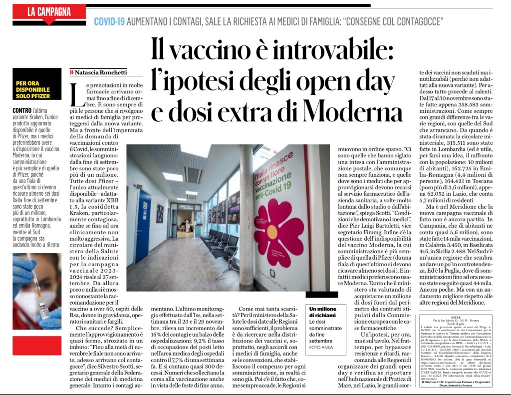 Le prenotazioni in molte farmacie arrivano ormai fino a fine di dicembre. E sono sempre di più le persone che si rivolgono ai medici di famiglia per proteggersi dalla nuova variante. Ma a fronte dell’impennata della domanda di vaccinazioni contro il Covid, le somministrazioni languono: dalla fine di settembre sono state poco più di un milione. Tutte dosi Pfizer – l’unico attualmente disponibile – adattato alla variante XBB 1.5, la cosiddetta Kraken, particolarmente contagiosa, anche se fino ad ora clinicamente non molto aggressiva. La circolare del ministero della Salute con le indicazioni per la campagna vaccinale 2023- 2024 risale al 27 settembre. Da allora poco o nulla si è mosso nonostante la raccomandazione per il vaccino a over 60, ospiti delle Rsa, donne in gravidanza, operatori sanitari e fargili.