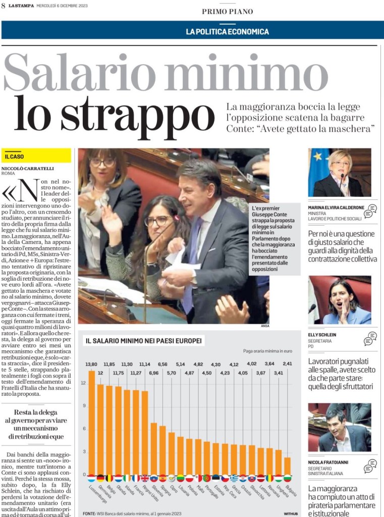 «Non nel nostro nome». I leader delle opposizioni intervengono uno dopo l’altro, con un crescendo studiato, per annunciare il ritiro della propria firma dalla legge che fu sul salario minimo. La maggioranza, nell’Aula della Camera, ha appena bocciato l’emendamento unitario di Pd, M5s, Sinistra-Verdi, Azione e +Europa: l’estremo tentativo di ripristinare la proposta originaria, con la soglia di retribuzione dei nove euro lordi all’ora. «Avete gettato la maschera e votate no al salario minimo, dovete vergognarvi – attacca Giuseppe Conte –. Con la stessa arroganza con cui fermate i treni, oggi fermate la speranza di quasi quattro milioni di lavoratori». E allora quello che resta, la delega al governo per avviare entro sei mesi un meccanismo che garantisca retribuzioni eque, è solo «carta straccia», dice il presidente 5 stelle, strappando platealmente i fogli con sopra il testo dell’emendamento di Fratelli d’Italia che ha snaturato la proposta.