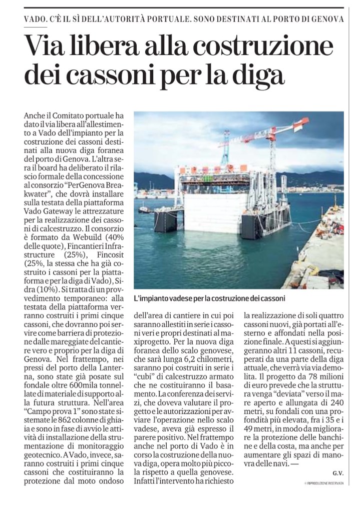 Anche il Comitato portuale ha dato il via libera all’allestimento a Vado dell’impianto per la costruzione dei cassoni destinati alla nuova diga foranea del porto di Genova. L’altra sera il board ha deliberato il rilascio formale della concessione al consorzio “PerGenova Breakwater”, che dovrà installare sulla testata della piattaforma Vado Gateway le attrezzature per la realizzazione dei cassoni di calcestruzzo. Il consorzio è formato da Webuild (40% delle quote), Fincantieri Infrastructure (25%), Fincosit (25%, la stessa che ha già costruito i cassoni per la piattaforma e per la diga di Vado), Sidra (10%). Si tratta di un provvedimento temporaneo: alla testata della piattaforma verranno costruiti i primi cinque cassoni, che dovranno poi servire come barriera di protezione dalle mareggiate del cantiere vero e proprio per la diga di Genova. Nel frattempo, nei pressi del porto della Lanterna, sono state già posate sul fondale oltre 600mila tonnellate di materiale di supporto alla futura struttura. Nell’area “Campo prova 1” sono state sistemate le 862 colonne di ghiaia e sono in fase di avvio le attività di installazione della strumentazione di monitoraggio geotecnico. A Vado, invece, saranno costruiti i primi cinque cassoni che costituiranno la protezione dal moto ondoso dell’area di cantiere in cui poi saranno allestiti in serie i cassoni veri e propri destinati al maxiprogetto. Per la nuova diga foranea dello scalo genovese, che sarà lunga 6,2 chilometri, saranno poi costruiti in serie i “cubi” di calcestruzzo armato che ne costituiranno il basamento. La conferenza dei servizi, che doveva valutare il progetto e le autorizzazioni per avviare l’operazione nello scalo vadese, aveva già espresso il parere positivo. Nel frattempo anche nel porto di Vado è in corso la costruzione della nuova diga, opera molto più piccola rispetto a quella genovese. Infatti l’intervento ha richiesto la realizzazione di soli quattro cassoni nuovi, già portati all’esterno e affondati nella posizione finale. A questi si aggiungeranno altri 11 cassoni, recuperati da una parte della diga attuale, che verrà via via demolita. Il progetto da 78 milioni di euro prevede che la struttura venga “deviata” verso il mare aperto e allungata di 240 metri, su fondali con una profondità più elevata, fra i 35 e i 49 metri, in modo da migliorare la protezione delle banchine e della costa, ma anche per aumentare gli spazi di manovra delle navi. —