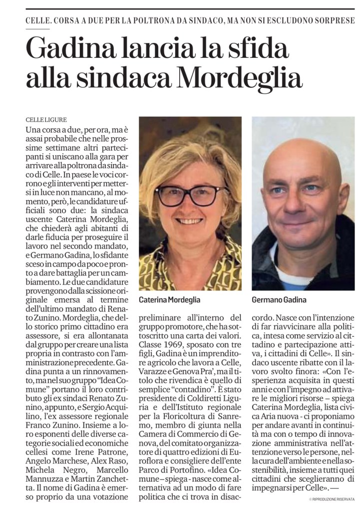 Una corsa a due, per ora, ma è assai probabile che nelle prossime settimane altri partecipanti si uniscano alla gara per arrivare alla poltrona da sindaco di Celle. In paese le voci corrono e gli interventi per mettersi in luce non mancano, al momento, però, le candidature ufficiali sono due: la sindaca uscente Caterina Mordeglia, che chiederà agli abitanti di darle fiducia per proseguire il lavoro nel secondo mandato, e Germano Gadina, lo sfidante sceso in campo da poco e pronto a dare battaglia per un cambiamento. Le due candidature provengono dalla scissione originale emersa al termine dell’ultimo mandato di Renato Zunino. Mordeglia, che dello storico primo cittadino era assessore, si era allontanata dal gruppo per creare una lista propria in contrasto con l’amministrazione precedente. Gadina punta a un rinnovamento, ma nel suo gruppo “Idea Comune” portano il loro contributo gli ex sindaci Renato Zunino, appunto, e Sergio Acquilino, l’ex assessore regionale Franco Zunino. Insieme a loro esponenti delle diverse categorie sociali ed economiche cellesi come Irene Patrone, Angelo Marchese, Alex Raso, Michela Negro, Marcello Mannuzza e Martin Zanchetta. Il nome di Gadina è emerso proprio da una votazione preliminare all’interno del gruppo promotore, che ha sottoscritto una carta dei valori. Classe 1969, sposato con tre figli, Gadina è un imprenditore agricolo che lavora a Celle, Varazze e Genova Pra’, ma il titolo che rivendica è quello di semplice “contadino”. È stato presidente di Coldiretti Liguria e dell’Istituto regionale per la Floricoltura di Sanremo, membro di giunta nella Camera di Commercio di Genova, del comitato organizzatore di quattro edizioni di Euroflora e consigliere dell’ente Parco di Portofino. «Idea Comune – spiega – nasce come alternativa ad un modo di fare politica che ci trova in disaccordo. Nasce con l’intenzione di far riavvicinare alla politica, intesa come servizio al cittadino e partecipazione attiva, i cittadini di Celle». Il sindaco uscente ribatte con il lavoro svolto finora: «Con l’esperienza acquisita in questi anni e con l’impegno ad attivare le migliori risorse – spiega Caterina Mordeglia, lista civica Aria nuova – ci proponiamo per andare avanti in continuità ma con o tempo di innovazione amministrativa nell’attenzione verso le persone, nella cura dell’ambiente e nella sostenibilità, insieme a tutti quei cittadini che sceglieranno di impegnarsi per Celle». —