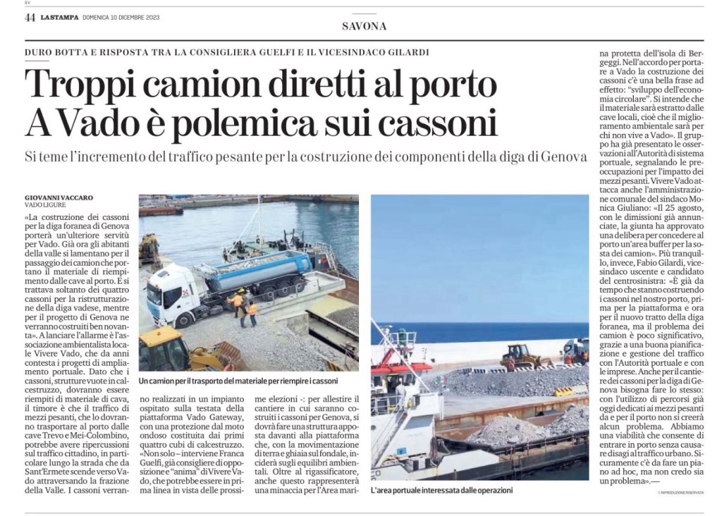 «La costruzione dei cassoni per la diga foranea di Genova porterà un’ulteriore servitù per Vado. Già ora gli abitanti della valle si lamentano per il passaggio dei camion che portano il materiale di riempimento dalle cave al porto. E si trattava soltanto dei quattro cassoni per la ristrutturazione della diga vadese, mentre per il progetto di Genova ne verranno costruiti ben novanta». A lanciare l’allarme è l’associazione ambientalista locale Vivere Vado, che da anni contesta i progetti di ampliamento portuale. Dato che i cassoni, strutture vuote in calcestruzzo, dovranno essere riempiti di materiale di cava, il timore è che il traffico di mezzi pesanti, che lo dovranno trasportare al porto dalle cave Trevo e Mei-Colombino, potrebbe avere ripercussioni sul traffico cittadino, in particolare lungo la strada che da Sant’Ermete scende verso Vado attraversando la frazione della Valle. I cassoni verranno realizzati in un impianto ospitato sulla testata della piattaforma Vado Gateway, con una protezione dal moto ondoso costituita dai primi quattro cubi di calcestruzzo. «Non solo – interviene Franca Guelfi, già consigliere di opposizione e “anima” di Vivere Vado, che potrebbe essere in prima linea in vista delle prossime elezioni -: per allestire il cantiere in cui saranno costruiti i cassoni per Genova, si dovrà fare una struttura apposta davanti alla piattaforma che, con la movimentazione di terra e ghiaia sul fondale, inciderà sugli equilibri ambientali. Oltre al rigassificatore, anche questo rappresenterà una minaccia per l’Area marina protetta dell’isola di Bergeggi. Nell’accordo per portare a Vado la costruzione dei cassoni c’è una bella frase ad effetto: “sviluppo dell’economia circolare”. Si intende che il materiale sarà estratto dalle cave locali, cioè che il miglioramento ambientale sarà per chi non vive a Vado». Il gruppo ha già presentato le osservazioni all’Autorità di sistema portuale, segnalando le preoccupazioni per l’impatto dei mezzi pesanti. Vivere Vado attacca anche l’amministrazione comunale del sindaco Monica Giuliano: «Il 25 agosto, con le dimissioni già annunciate, la giunta ha approvato una delibera per concedere al porto un’area buffer per la sosta dei camion». Più tranquillo, invece, Fabio Gilardi, vicesindaco uscente e candidato del centrosinistra: «È già da tempo che stanno costruendo i cassoni nel nostro porto, prima per la piattaforma e ora per il nuovo tratto della diga foranea, ma il problema dei camion è poco significativo, grazie a una buona pianificazione e gestione del traffico con l’Autorità portuale e con le imprese. Anche per il cantiere dei cassoni per la diga di Genova bisogna fare lo stesso: con l’utilizzo di percorsi già oggi dedicati ai mezzi pesanti da e per il porto non si creerà alcun problema. Abbiamo una viabilità che consente di entrare in porto senza causare disagi al traffico urbano. Sicuramente c’è da fare un piano ad hoc, ma non credo sia un problema».—