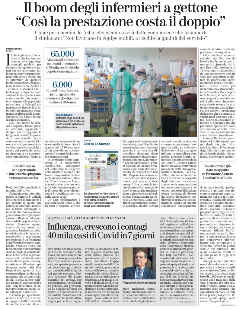 Quanti siano gli infermieri pagati a gettone è difficile dirlo perché il fenomeno è più recente di quello che coinvolge da tempo i medici. Ma si tratta comunque di un’onda che monta, coinvolgendo un numero già significativo di Regioni dal punto di vista della popolazione assistita. Secondo quanto emerso da una nostra ricognizione, l’assistenza infermieristica data in appalto a cooperative o associazioni professionali è un fenomeno già diffuso in Piemonte, Lombardia, Veneto e Lazio, che messe insieme fanno ben più di un terzo degli assistiti d’Italia. Ma il ricorso ai gettonisti, secondo il sindacato autonomo di categoria Nursing, è destinato a diffondersi rapidamente anche nelle altre Regioni. Con spreco di risorse e pericoli per la salute, dal momento che costano molto di più rispetto ai loro colleghi assunti in pianta stabile e che, non lavorando in équipe professionali stabili, sono più soggetti ad errore.