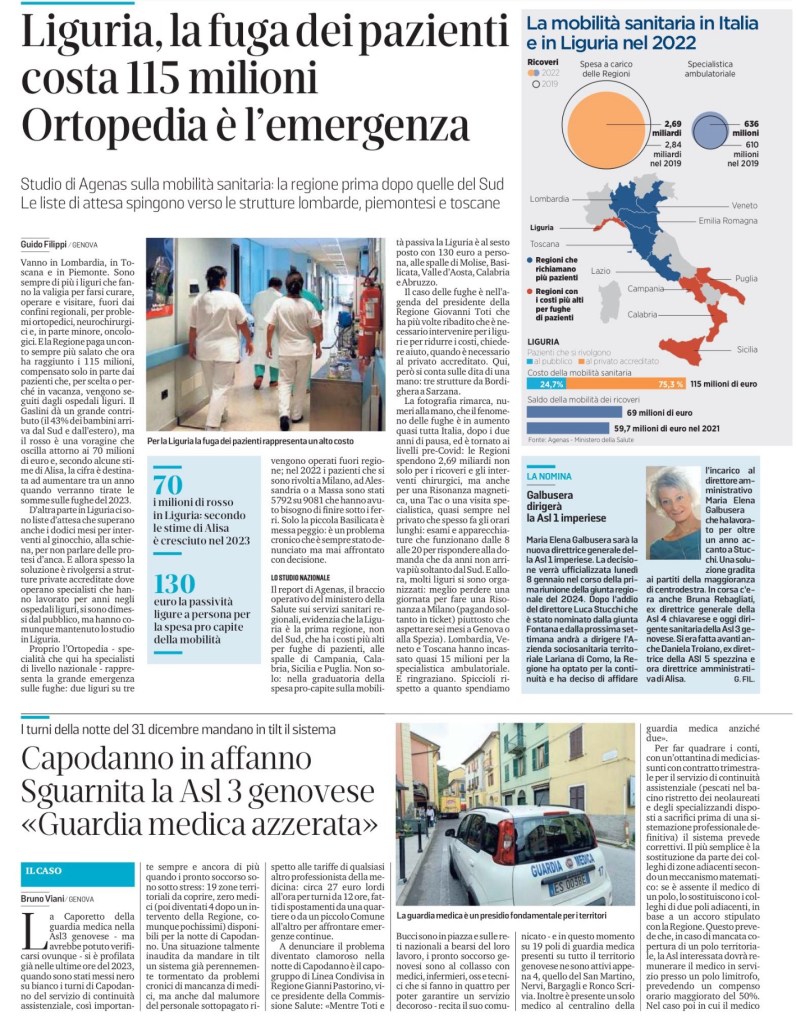 Sono sempre di più i liguri che fanno la valigia per farsi visitare e operare in Lombardia, Piemonte e Toscana. La fuga verso altre Regioni ha raggiunto quota 115 milioni. Il quadro emerge dallo studio nazionale di Agenas, il braccio operativo del ministero della Salute, sulla mobilità sanitaria in Italia. L’emergenza è rappresentata dall’Ortopedia: due pazienti su tre vengono operati lontano dalla Liguria. L’assessore regionale alla sanità Angelo Gratarola:«Investiamo 50 milioni. Daremo incentivi a chi lavora in ospedale e chiederemo aiuto ai privati accreditati».