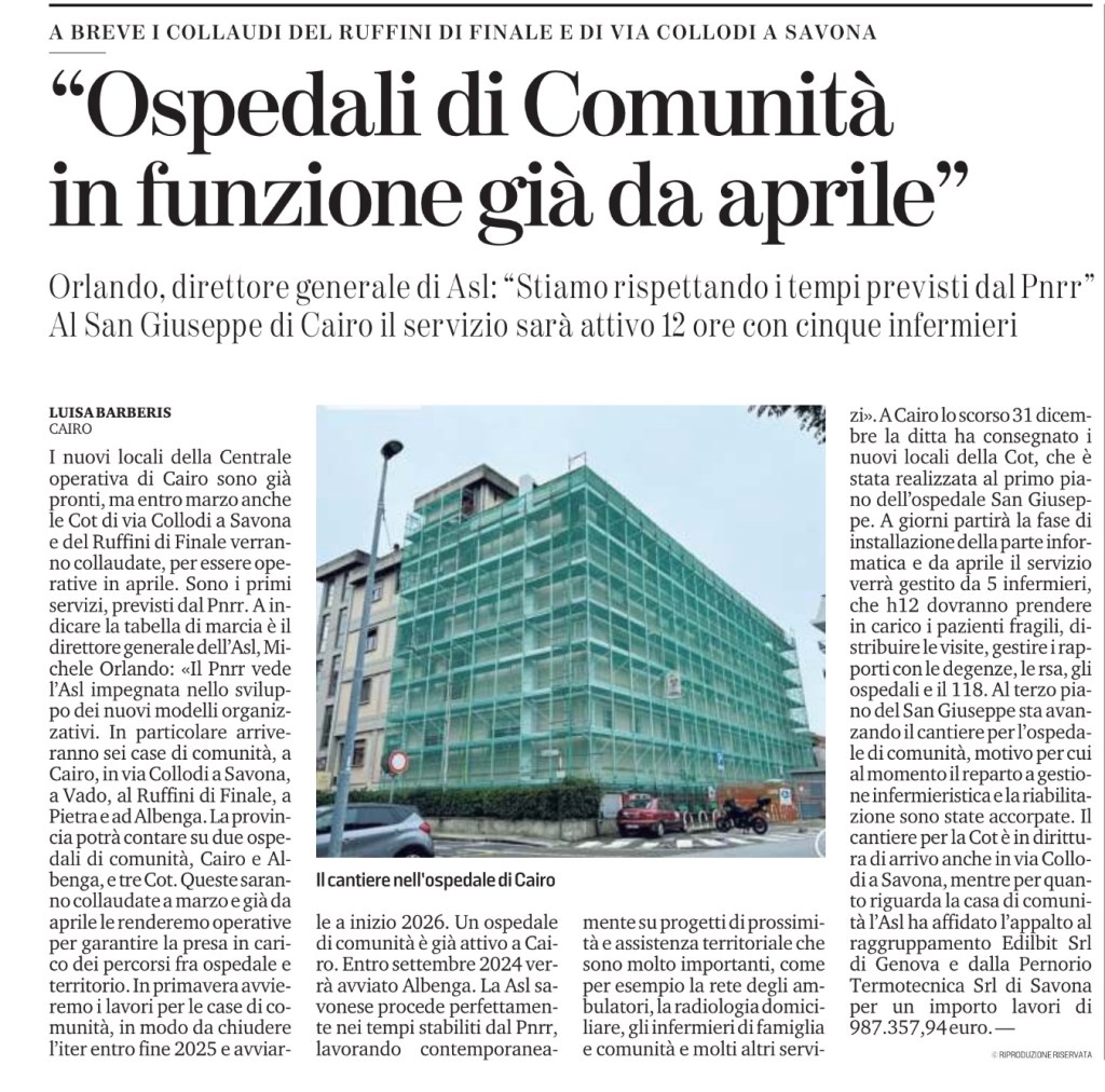 I nuovi locali della Centrale operativa di Cairo sono già pronti, ma entro marzo anche le Cot di via Collodi a Savona e del Ruffini di Finale verranno collaudate, per essere operative in aprile. Sono i primi servizi, previsti dal Pnrr. A indicare la tabella di marcia è il direttore generale dell’Asl, Michele Orlando: «Il Pnrr vede l’Asl impegnata nello sviluppo dei nuovi modelli organizzativi. In particolare arriveranno sei case di comunità, a Cairo, in via Collodi a Savona, a Vado, al Ruffini di Finale, a Pietra e ad Albenga. La provincia potrà contare su due ospedali di comunità, Cairo e Albenga, e tre Cot. Queste saranno collaudate a marzo e già da aprile le renderemo operative per garantire la presa in carico dei percorsi fra ospedale e territorio. In primavera avvieremo i lavori per le case di comunità, in modo da chiudere l’iter entro fine 2025 e avviarle a inizio 2026. Un ospedale di comunità è già attivo a Cairo. Entro settembre 2024 verrà avviato Albenga. La Asl savonese procede perfettamente nei tempi stabiliti dal Pnrr, lavorando contemporaneamente su progetti di prossimità e assistenza territoriale che sono molto importanti, come per esempio la rete degli ambulatori, la radiologia domiciliare, gli infermieri di famiglia e comunità e molti altri servizi». A Cairo lo scorso 31 dicembre la ditta ha consegnato i nuovi locali della Cot, che è stata realizzata al primo piano dell’ospedale San Giuseppe. A giorni partirà la fase di installazione della parte informatica e da aprile il servizio verrà gestito da 5 infermieri, che h12 dovranno prendere in carico i pazienti fragili, distribuire le visite, gestire i rapporti con le degenze, le rsa, gli ospedali e il 118. Al terzo piano del San Giuseppe sta avanzando il cantiere per l’ospedale di comunità, motivo per cui al momento il reparto a gestione infermieristica e la riabilitazione sono state accorpate. Il cantiere per la Cot è in dirittura di arrivo anche in via Collodi a Savona, mentre per quanto riguarda la casa di comunità l’Asl ha affidato l’appalto al raggruppamento Edilbit Srl di Genova e dalla Pernorio Termotecnica Srl di Savona per un importo lavori di 987.357,94 euro. —