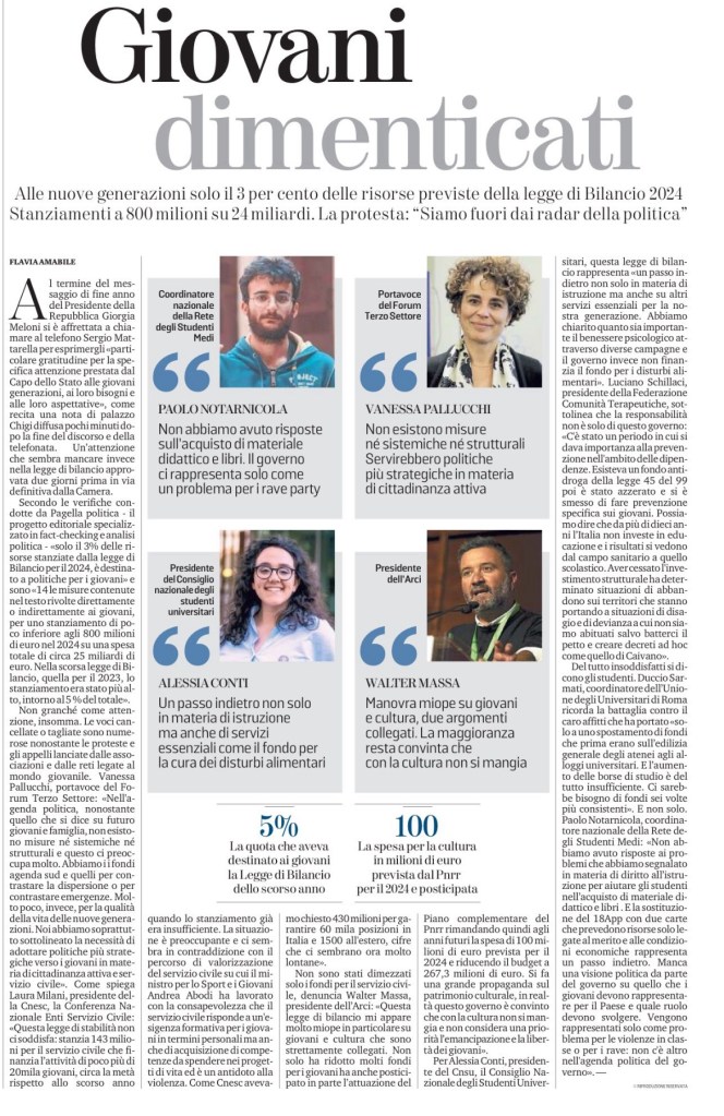 Non sono stati dimezzati solo i fondi per il servizio civile, denuncia Walter Massa, presidente dell’Arci: «Questa legge di bilancio mi appare molto miope in particolare su giovani e cultura che sono strettamente collegati. Non solo ha ridotto molti fondi per i giovani ha anche posticipato in parte l’attuazione del Piano complementare del Pnrr rimandando quindi agli anni futuri la spesa di 100 milioni di euro prevista per il 2024 e riducendo il budget a 267,3 milioni di euro. Si fa una grande propaganda sul patrimonio culturale, in realtà questo governo è convinto che con la cultura non si mangia e non considera una priorità l’emancipazione e la libertà dei giovani».