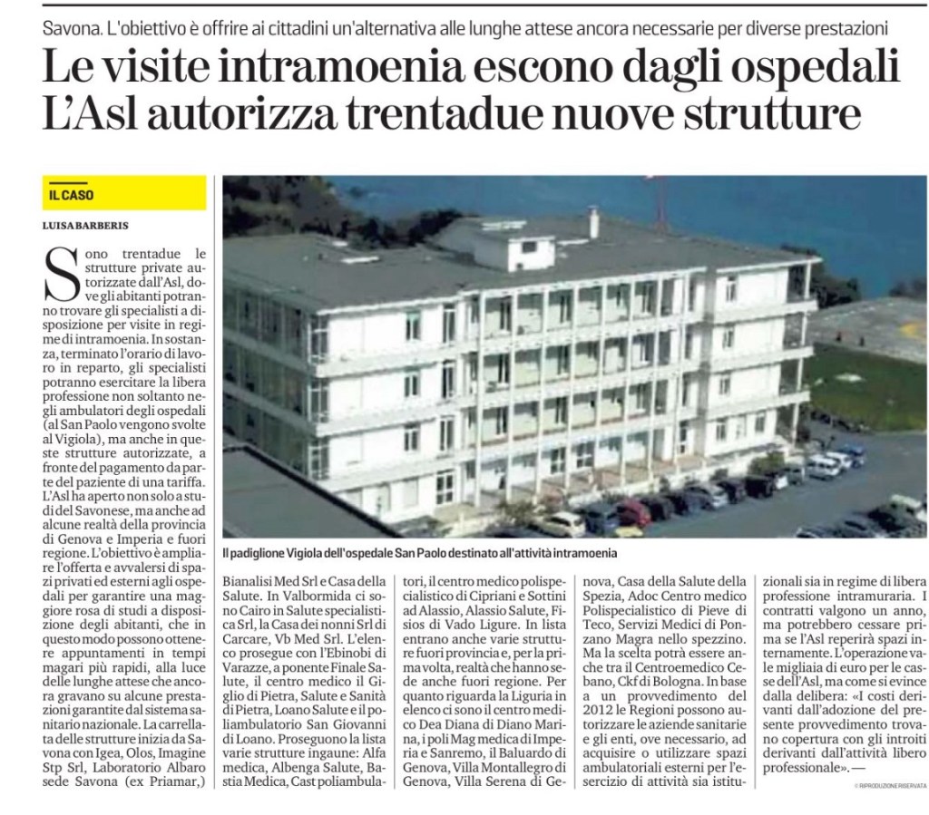Sono trentadue le strutture private autorizzate dall’Asl, dove gli abitanti potranno trovare gli specialisti a disposizione per visite in regime di intramoenia. In sostanza, terminato l’orario di lavoro in reparto, gli specialisti potranno esercitare la libera professione non soltanto negli ambulatori degli ospedali (al San Paolo vengono svolte al Vigiola), ma anche in queste strutture autorizzate, a fronte del pagamento da parte del paziente di una tariffa. L’Asl ha aperto non solo a studi del Savonese, ma anche ad alcune realtà della provincia di Genova e Imperia e fuori regione. L’obiettivo è ampliare l’offerta e avvalersi di spazi privati ed esterni agli ospedali per garantire una maggiore rosa di studi a disposizione degli abitanti, che in questo modo possono ottenere appuntamenti in tempi magari più rapidi, alla luce delle lunghe attese che ancora gravano su alcune prestazioni garantite dal sistema sanitario nazionale. La carrellata delle strutture inizia da Savona con Igea, Olos, Imagine Stp Srl, Laboratorio Albaro sede Savona (ex Priamar,) Bianalisi Med Srl e Casa della Salute. In Valbormida ci sono Cairo in Salute specialistica Srl, la Casa dei nonni Srl di Carcare, Vb Med Srl. L’elenco prosegue con l’Ebinobi di Varazze, a ponente Finale Salute, il centro medico il Giglio di Pietra, Salute e Sanità di Pietra, Loano Salute e il poliambulatorio San Giovanni di Loano. Proseguono la lista varie strutture ingaune: Alfa medica, Albenga Salute, Bastia Medica, Cast poliambulatori, il centro medico polispecialistico di Cipriani e Sottini ad Alassio, Alassio Salute, Fisios di Vado Ligure. In lista entrano anche varie strutture fuori provincia e, per la prima volta, realtà che hanno sede anche fuori regione. Per quanto riguarda la Liguria in elenco ci sono il centro medico Dea Diana di Diano Marina, i poli Mag medica di Imperia e Sanremo, il Baluardo di Genova, Villa Montallegro di Genova, Villa Serena di Genova, Casa della Salute della Spezia, Adoc Centro medico Polispecialistico di Pieve di Teco, Servizi Medici di Ponzano Magra nello spezzino. Ma la scelta potrà essere anche tra il Centroemedico Cebano, Ckf di Bologna. In base a un provvedimento del 2012 le Regioni possono autorizzare le aziende sanitarie e gli enti, ove necessario, ad acquisire o utilizzare spazi ambulatoriali esterni per l’esercizio di attività sia istituzionali sia in regime di libera professione intramuraria. I contratti valgono un anno, ma potrebbero cessare prima se l’Asl reperirà spazi internamente. L’operazione vale migliaia di euro per le casse dell’Asl, ma come si evince dalla delibera: «I costi derivanti dall’adozione del presente provvedimento trovano copertura con gli introiti derivanti dall’attività libero professionale». —
