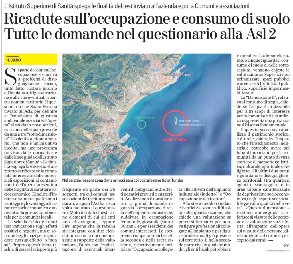 Si parte dai dati sull’occupazione e si arriva ai problemi di disuguaglianze sociali, tutto fatto ruotare intorno all’impianto di rigassificazione e alle sue eventuali ripercussioni sul territorio. Il questionario che Snam Fsru ha inviato all’Asl2 per definire le “condizioni di giustizia ambientale associate all’opera” si snoda in nove sezioni, ciascuna delle quali prevede da una a tre “sottodimensioni”. L’obiettivo del questionario, che non è un’iniziativa inedita, ma una procedura prevista dalle normative e dalle linee guida dell’Istituto Superiore di Sanità: «La finalità – spiega lo stesso Iss – è anzitutto verificare se le comunità interessate dalle potenziali esposizioni ai contaminanti dell’opera presentino delle fragilità di carattere socioeconomico. È inoltre d’interesse valutare quali siano i vantaggi e gli svantaggi di carattere socioeconomico e attinenti alla giustizia ambientale per le comunità locali».
