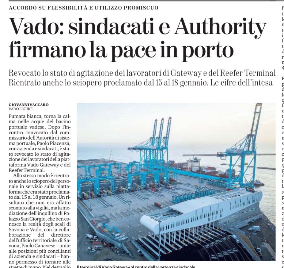 Fumata bianca, torna la calma nelle acque del bacino portuale vadese. Dopo l’incontro convocato dal commissario dell’Autorità di sistema portuale, Paolo Piacenza, con azienda e sindacati, è stato revocato lo stato di agitazione dei lavoratori della piattaforma Vado Gateway e del Reefer Terminal.