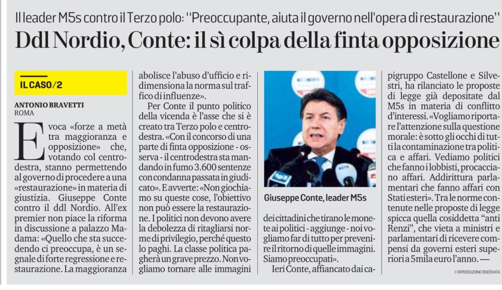 Per Conte il punto politico della vicenda è l’asse che si è creato tra Terzo polo e centrodestra. «Con il concorso di una parte di finta opposizione – osserva – il centrodestra sta mandando in fumo 3.600 sentenze con condanna passata in giudicato». E avverte: «Non giochiamo su queste cose, l’obiettivo non può essere la restaurazione. I politici non devono avere la debolezza di ritagliarsi norme di privilegio, perché questo lo paghi. La classe politica pagherà un grave prezzo. Non vogliamo tornare alle immagini dei cittadini che tirano le monete ai politici – aggiunge – noi vogliamo far di tutto per prevenire il ritorno di quelle immagini. Siamo preoccupati».
