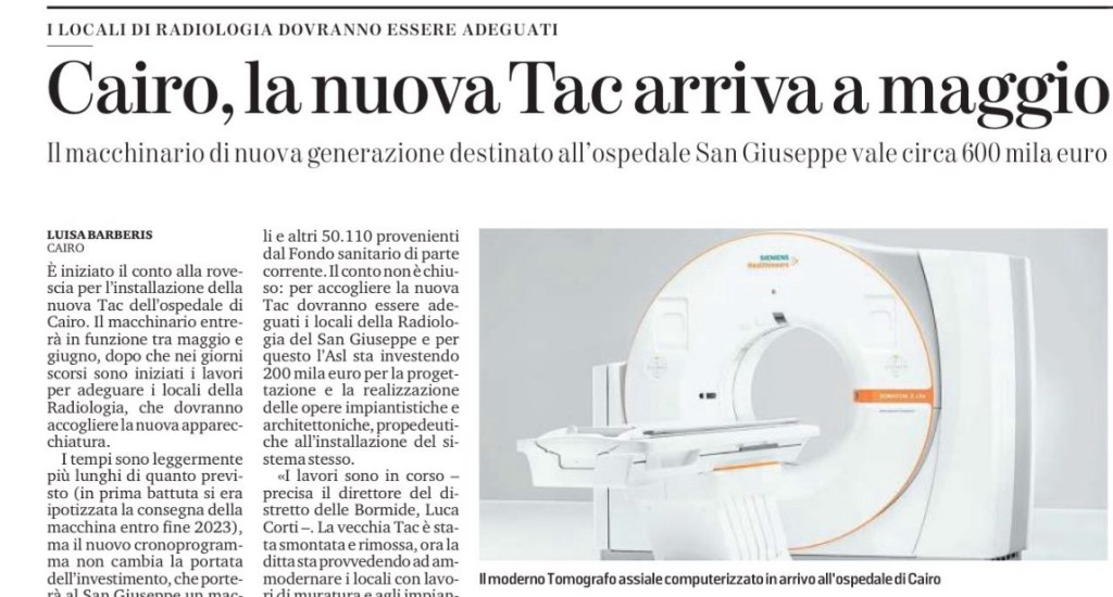 È iniziato il conto alla rovescia per l’installazione della nuova Tac dell’ospedale di Cairo. Il macchinario entrerà in funzione tra maggio e giugno, dopo che nei giorni scorsi sono iniziati i lavori per adeguare i locali della Radiologia, che dovranno accogliere la nuova apparecchiatura.
