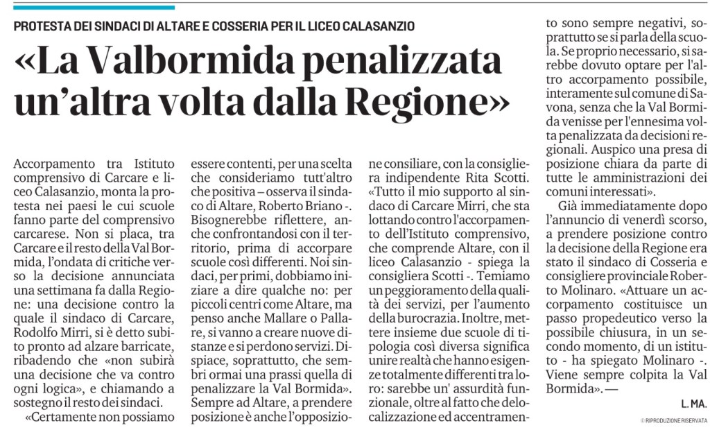 Nessun commento dal preside del Mazzini da Vinci, Mauro Ferrando. Invece Maria Laura Tasso ha così commentato: «Nessuna interlocuzione su un eventuale dimensionamento del Boselli-Alberti è mai stata evidenziata con il mio istituto. Il 21 settembre scorso la Provincia aveva ipotizzato tre possibilità: Comprensivo di Spotorno con Finale Ligure; Comprensivo di Quiliano con Vado e Liceo Calasanzio con Comprensivo di Carcare. Nel consiglio provinciale del 10 ottobre era stato formalizzato l’accorpamento del Comprensivo di Spotorno con quello di Quiliano. Non ho altro da aggiungere al momento».