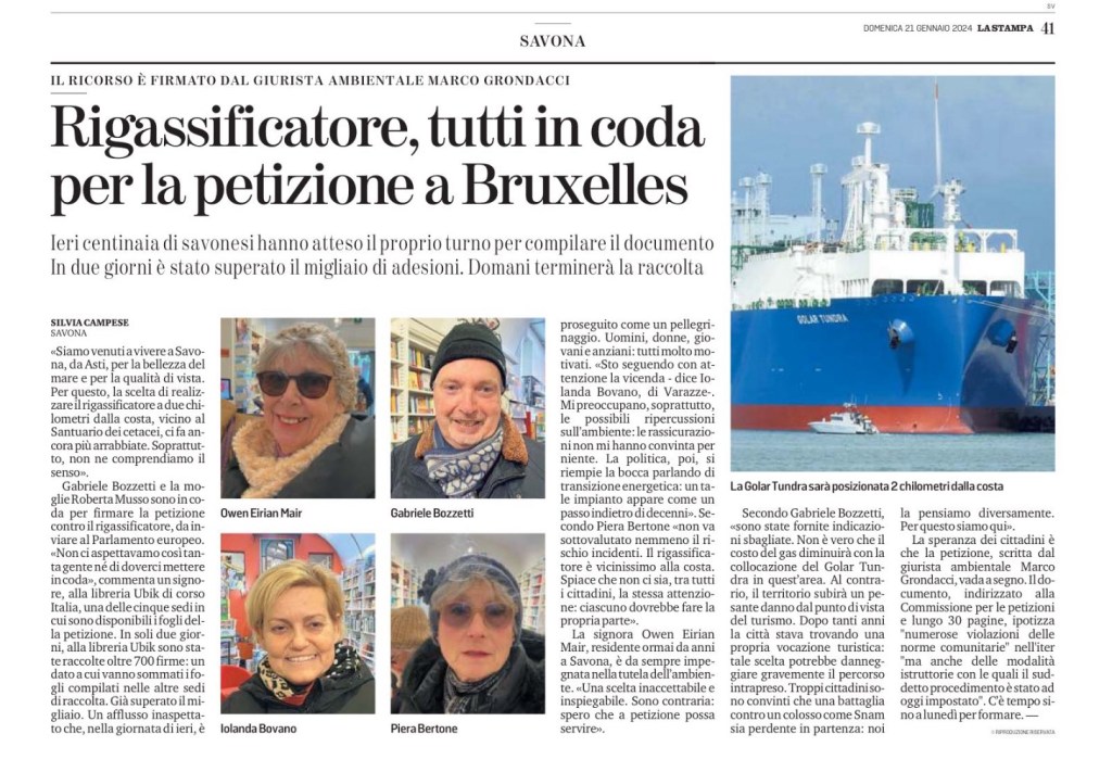 Gabriele Bozzetti e la moglie Roberta Musso sono in coda per firmare la petizione contro il rigassificatore, da inviare al Parlamento europeo. «Non ci aspettavamo così tanta gente né di doverci mettere in coda», commenta un signore, alla libreria Ubik di corso Italia, una delle cinque sedi in cui sono disponibili i fogli della petizione. In soli due giorni, alla libreria Ubik sono state raccolte oltre 700 firme: un dato a cui vanno sommati i fogli compilati nelle altre sedi di raccolta. Già superato il migliaio. Un afflusso inaspettato che, nella giornata di ieri, è proseguito come un pellegrinaggio. Uomini, donne, giovani e anziani: tutti molto motivati. «Sto seguendo con attenzione la vicenda – dice Iolanda Bovano, di Varazze-. Mi preoccupano, soprattutto, le possibili ripercussioni sull’ambiente: le rassicurazioni non mi hanno convinta per niente. La politica, poi, si riempie la bocca parlando di transizione energetica: un tale impianto appare come un passo indietro di decenni». Secondo Piera Bertone «non va sottovalutato nemmeno il rischio incidenti. Il rigassificatore è vicinissimo alla costa. Spiace che non ci sia, tra tutti i cittadini, la stessa attenzione: ciascuno dovrebbe fare la propria parte».