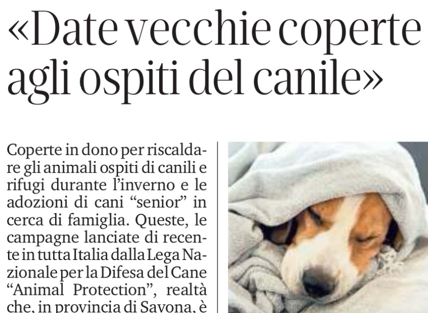 Coperte in dono per riscaldare gli animali ospiti di canili e rifugi durante l’inverno e le adozioni di cani “senior” in cerca di famiglia. Queste, le campagne lanciate di recente in tutta Italia dalla Lega Nazionale per la Difesa del Cane “Animal Protection”, realtà che, in provincia di Savona, è rappresentata dalla sezione cittadina che gestisce il canile municipale di Legino e da quella della Valbormida che dirige la stessa struttura a Cairo Montenotte.