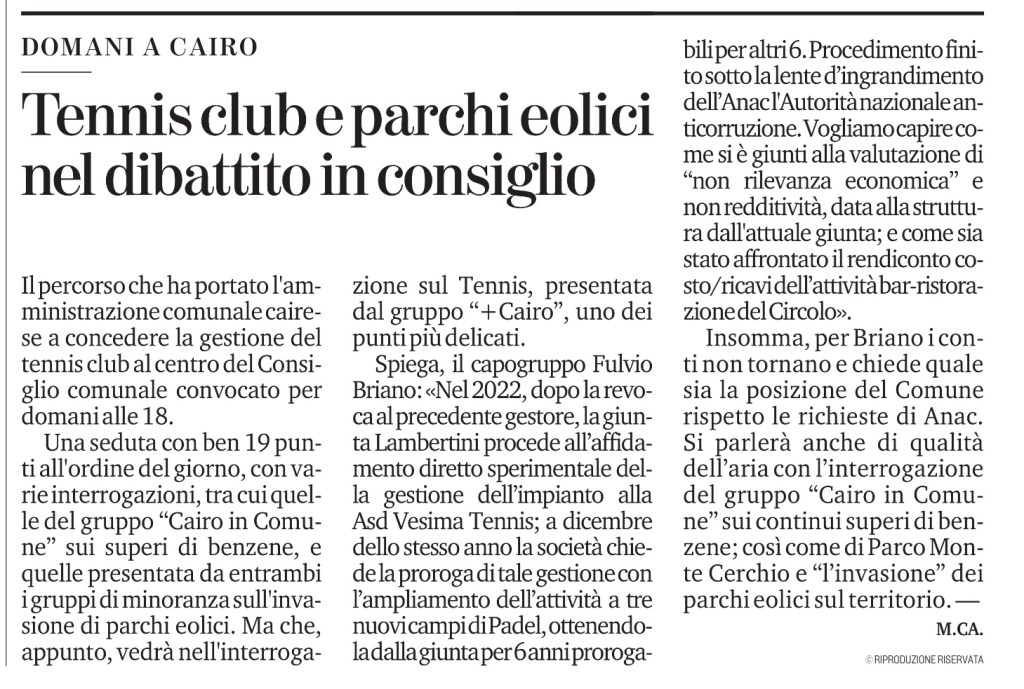 Una seduta con ben 19 punti all’ordine del giorno, con varie interrogazioni, tra cui quelle del gruppo “Cairo in Comune” sui superi di benzene, e quelle presentata da entrambi i gruppi di minoranza sull’invasione di parchi eolici. Ma che, appunto, vedrà nell’interrogazione sul Tennis, presentata dal gruppo “+Cairo”, uno dei punti più delicati.
