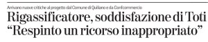 Il presidente della Regione e commissario per l’opera, Giovanni Toti, esprime soddisfazione: «E’ stato respinto un ricorso che ritenevamo inappropriato. Partecipano alla conferenza dei servizi i Comuni il cui territorio è interessato dall’opera. Lo decide la legge, non il presidente Toti né tanto meno il commissario». A Quiliano hanno confermato la contrarietà i capigruppo convocati dal sindaco Nicola Isetta dopo le dichiarazioni di Toti, che aveva detto di aspettare dal Comune la decisione definitiva sul sito migliore in cui installare la stazione di pompaggio. «Una modalità assai irrituale – sottolinea Isetta -. Per noi l’unica opzione è il ritiro del progetto». Sulla stessa linea il capogruppo di opposizione Rodolfo Fersini: «Quella di Toti è una domanda alquanto originale e inaspettata, di cui non comprendiamo le motivazioni. Riteniamo sia necessario, in termini di chiarezza, ribadire nuovamente la nostra posizione in merito al rigassificatore: abbiamo già votato all’unanimità in consiglio comunale contro l’intero progetto. “Irricevibile” è l’unica risposta possibile e la ribadiamo con forza».