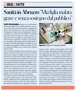 Sono costretta ad andare a Roma, a Firenze, o in generale in strutture private, per far fare a mia figlia di due anni le terapie più adatte, perché qui non c’è personale, né tantomeno strutture adatte per tutti; siamo in lista d’attesa, come tanti altri, ma se aspettassi di essere chiamata perderei solo tempo, tempo prezioso che nessuno ridarà a mia figlia… non ci dimentichiamo che non tutti possono andare fuori, o pagare strutture, quindi tutto questo va a discapito di tutti i bambini che hanno una reale e tempestiva necessità di fare terapia. Devo dire: doppiamente sfortunati per avere, non solo una malattia difficile, rara, ma anche per vivere a L’Aquila!