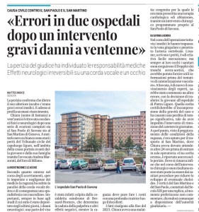 Chiara (nome di fantasia) a vent’anni si è ritrovata con danni fisici e neurologici dopo una serie di svarioni compiuti sia al San Paolo di Savona sia al San Martino di Genova. A metterlo nero su bianco sono stati i periti del Tribunale civile del capoluogo ligure, nell’ambito della causa portata avanti dalla giovane e dalla sua famiglia tramite l’avvocato Andrea Marzorati, del foro di Milano.