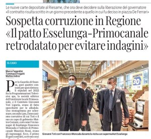La Finanza ricostruisce così quello che, secondo gli inquirenti, è il sistema di corruzione maturato in primis intorno alle elezioni comunali di Genova del 2022. È primavera e le amministrative sono alle porte. La mattina del 17 marzo, in un incontro con Cozzani e Toti in Regione, Moncada, su richiesta dei due, spiega che Esselunga (all’epoca era membro del consiglio d’amministrazione) ha incontrato un ostacolo con un ufficio regionale per aprire il nuovo punto vendita di Sestri Ponente. Lo stesso giorno, nel tardo pomeriggio, Toti non c’è più ma arriva Rossi, sempre in Regione. E Moncada, intercettato, dice di voler aiutare Marco Bucci, sindaco ricandidato. Lasciando intendere, per la Finanza, che un sostegno ora potrebbe sempre venire bene. Per gli investigatori, in quel momento i tre prendono accordi che favoriranno ogni parte in causa. Il sostegno a Bucci si concretizzerà di fatto nel pagamento di spot elettorali per i candidati della Lista Toti da proiettare sul maxi schermo gestito da Rossi, sulla Terrazza Colombo che sovrasta la sede di Primocanale. Si decide di fare alcuni contratti in chiaro, per un valore di 5 mila euro, pagati direttamente dai comitati elettorali. Ma, spiegano gli inquirenti, ne arriverà anche uno da 50 mila di Esselunga a favore della società di Rossi, formalmente per una campagna pubblicitaria del colosso della grande distribuzione. Una consulenza tecnica chiesta dalla Procura però stabilisce ora che a fronte dei 500 spot collegati al contratto da 5 mila euro, ne sono stati prodotti 6.060. Gli investigatori hanno pochi dubbi: la differenza sarebbe collegata ai 50 mila del contratto di Esselunga. Non per niente Rossi, intercettato, dice a Moncada: «Siete diventati il nostro primo cliente del gruppo… devo dire in verità dopo la Regione Liguria». E i vantaggi per Esselunga? Secondo quanto emerso dalle intercettazioni e dalle mail acquisite durante la perquisizione della sede del gruppo lombardo, Toti e Cozzani si erano impegnati a sbloccare e velocizzare pareri e pratiche di competenza regionale, così da favorire l’apertura del punto vendita di Sestri Ponente.