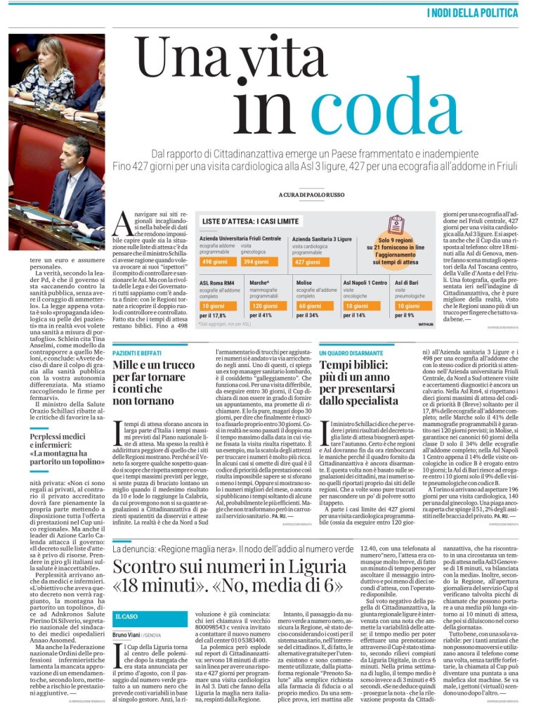 La polemica però esplode sul report di Cittadinanzattiva: servono 18 minuti di attesa in linea per avere una risposta e 427 giorni per programmare una visita cardiologica in Asl 3. Dati che fanno della Liguria la maglia nera italiana, respinti dalla Regione.