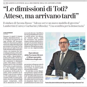 Nessuno (o quasi) è rimasto stupito. «Questione di ore…», si vociferava da giorni da un capo all’altro del Savonese. Tuttavia, il terremoto politico innescato dalle dimissioni del governatore Giovanni Toti ha provocato un’onda d’urto per nulla attutita nella nostra provincia, con reazioni che vanno dal garantismo a chi sostiene che il passo indietro sia persino tardivo. Quest’ultima è la linea del sindaco di Savona Marco Russo (centrosinistra), che commenta le dimissioni come: «Atto atteso e tardivo. Il punto però è che il modello di Governo era già tramontato e che bisogna costruirne un altro». Altrettanto netta è la posizione di Riccardo Tomatis, primo cittadino di Albenga a capo di una coalizione di centrosinistra: «A prescindere dalla vicenda giudiziaria, che sarà valutata dagli organi competenti, credo che le dimissioni di Toti siano un atto dovuto. Sarebbero dovute probabilmente arrivare anche prima, ma adesso, più valutare questo, credo sia necessario non perdere tempo e iniziare subito a lavorare per le prossime elezioni. Quello che mi auguro è che finalmente Albenga possa esprimere un suo rappresentante per portare in Regione tutte le necessità di un territorio come il nostro, in primis quelle sul tema della sanità».