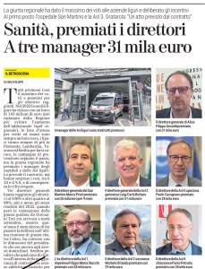 Torniamo agli esami e ai primi tre della classe. Al direttore generale del San Martino (in carica dal marzo del 2023) Marco Damonte Prioli vanno circa 26 mila euro, mentre al direttore sanitario Gianni Orengo, al direttore amministrativo Fabrizio Figallo e al direttore scientifico Antonio Uccelli spetta un premio di circa 22 mila euro. Incentivi al top, come l’anno precedente, anche per la guida della Asl 3 genovese Luigi Bottaro, premiato con 31 mila euro, 5 mila euro in più del suo team composto da Rosa Placido, Marta Caltabellotta e Lorenzo Sampietro (adesso in pensione). In vetta figura anche il direttore di Alisa Filippo Ansaldi, con la mente amministrativa Daniela Troiano e l’ex responsabile sanitario Michele Orlando, ora al timone della Asl 2. Non hanno raggiunto tutti gli obiettivi Filippo Maria Stucchi che, a dicembre, è rientrato in Lombardia ed è stato sostituito da Elena Galbusera.