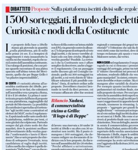 Non a caso nel regolamento c’è un paragrafo in cui si elencano i presunti vantaggi del sorteggio, primo tra tutti il “ridurre i favoritismi nei processi di selezione, rendendo difficile che vengano manipolati”. In sintesi, estrarre a sorte dovrebbe evitare cordate. Ma rimangono altre variabili da chiarire. Per esempio quanto incideranno i parlamentari sul risultato finale, cioè sulle proposte da votare. Per ora è previsto che in assemblea eletti esperti sui vari temi lavorino con gli iscritti per limare i suggerimenti in apposite tavole rotonde, trasmesse in streaming. Le proposte – “aggregate per grandi famiglie di temi” – verranno poi sottoposte al voto online degli iscritti da almeno sei mesi ai 5 Stelle. Ma come si arriverà al prodotto finale non è ancora chiarissimo. Non un dettaglio, mentre in serata il commercialista genovese Enrico Maria Nadasi, amico di Grillo e segretario della vecchia associazione Movimento 5 Stelle, riapre le ostilità: “Il simbolo del M5S è di Beppe, quel contrassegno ha avuto un’evoluzione con l’aggiunta della dicitura 2050, ma il Dna è suo”.