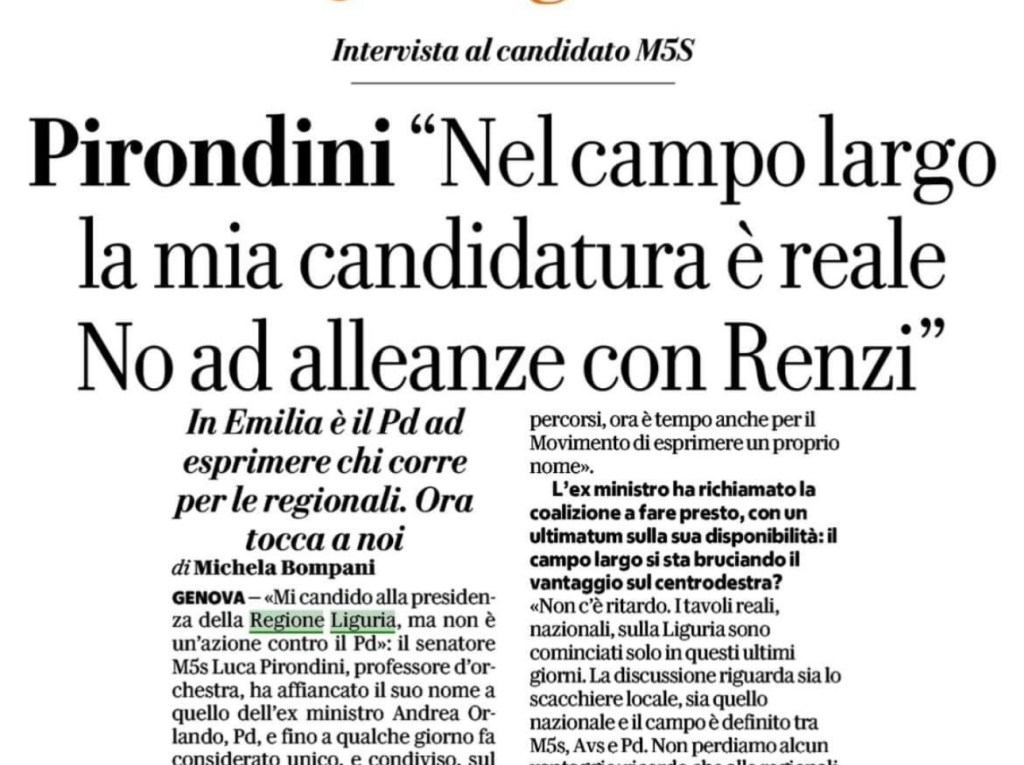 «Mi candido alla presidenza della Regione Liguria, ma non è un’azione contro il Pd»: il senatore M5s Luca Pirondini, professore d’orchestra, ha affiancato il suo nome a quello dell’ex ministro Andrea Orlando, Pd, e fino a qualche giorno fa considerato unico, e condiviso, sul tavolo del campo largo in Liguria. A due mesi esatti dal voto, il campo largo sembra bloccato, non sceglie il candidato, e Orlando ha dato l’ultimatum, chiedendo una decisione entro la settimana.