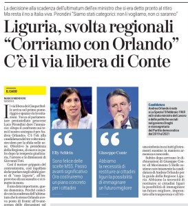 Subito dopo arrivano le dichiarazioni di Giuseppe Conte: «Il Movimento 5 Stelle sostiene convintamente la candidatura di Andrea Orlando per la guida della Regione Liguria. Abbiamo la necessità di restituire ai cittadini liguri la possibilità di immaginare un futuro migliore, improntato alla trasparenza e all’etica pubblica». Ancora Conte: «Il bene della Liguria significa oggi la convergenza sul profilo di maggiore unità: non ci tiriamo indietro, ci mettiamo al servizio dei cittadini. Andiamo avanti insieme per vincere questa importante sfida».