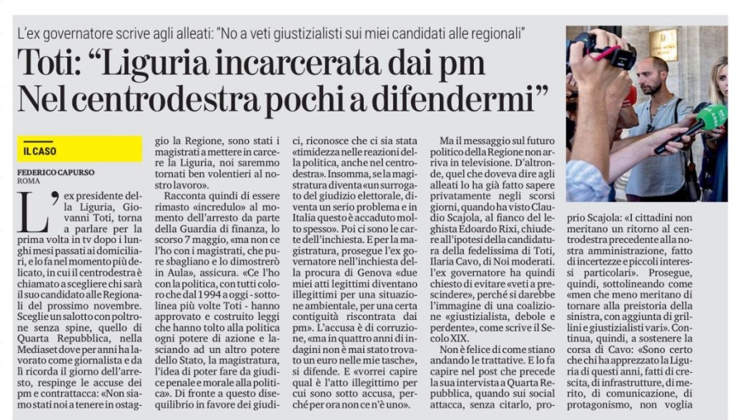 Ma il messaggio sul futuro politico della Regione non arriva in televisione. D’altronde, quel che doveva dire agli alleati lo ha già fatto sapere privatamente negli scorsi giorni, quando ha visto Claudio Scajola, al fianco del leghista Edoardo Rixi, chiudere all’ipotesi della candidatura della fedelissima di Toti, Ilaria Cavo, di Noi moderati. l’ex governatore ha quindi chiesto di evitare «veti a prescindere», perché si darebbe l’immagine di una coalizione «giustizialista, debole e perdente», come scrive il Secolo XIX.