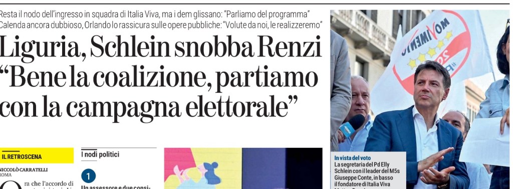Liguria, Schlein snobba Renzi “Bene la coalizione , partiamo con la campagna elettorale” Così su La Stampa