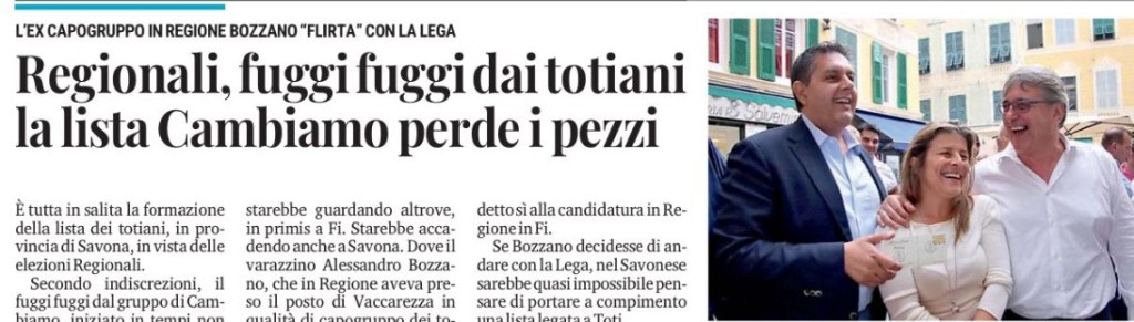 Se Bozzano decidesse di andare con la Lega, nel Savonese sarebbe quasi impossibile pensare di portare a compimento una lista legata a Toti.