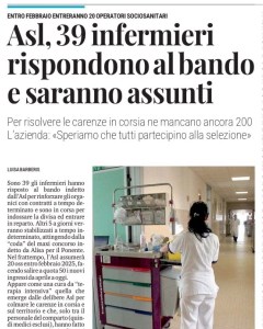 Sono 39 gli infermieri hanno risposto al bando indetto dall’Asl per rinforzare gli organici con contratti a tempo determinato e sono in corsa per indossare la divisa ed entrare in reparto. Altri 5 a giorni verranno stabilizzati a tempo indeterminato, attingendo dalla “coda” del maxi concorso indetto da Alisa per il Ponente. Nel frattempo, l’Asl assumerà 20 oss entro febbraio 2025, facendo salire a quota 50 i nuovi ingressi da aprile a oggi.
