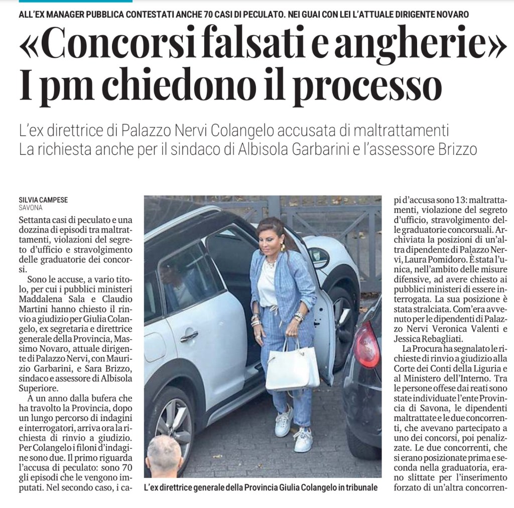 Sono le accuse, a vario titolo, per cui i pubblici ministeri Maddalena Sala e Claudio Martini hanno chiesto il rinvio a giudizio per Giulia Colangelo, ex segretaria e direttrice generale della Provincia, Massimo Novaro, attuale dirigente di Palazzo Nervi, con Maurizio Garbarini, e Sara Brizzo, sindaco e assessore di Albisola Superiore.