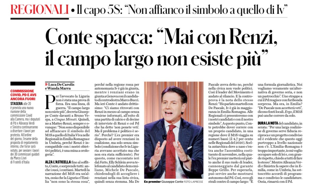 Per l’avvocato la Liguria non è stata una prova di forza. Era una linea, di guerra. “Il campo largo non esiste più”, decreta Giuseppe Conte davanti a Bruno Vespa, a Cinque Minuti. Quindi, no a Matteo Renzi, sempre e ovunque: “Non sono disponibile ad affiancare il simbolo del M5S a quello di Italia Viva nelle Regionali in Emilia Romagna e in Umbria, perché Renzi è incompatibile con i nostri obiettivi politici, è una mina a orologeria”.