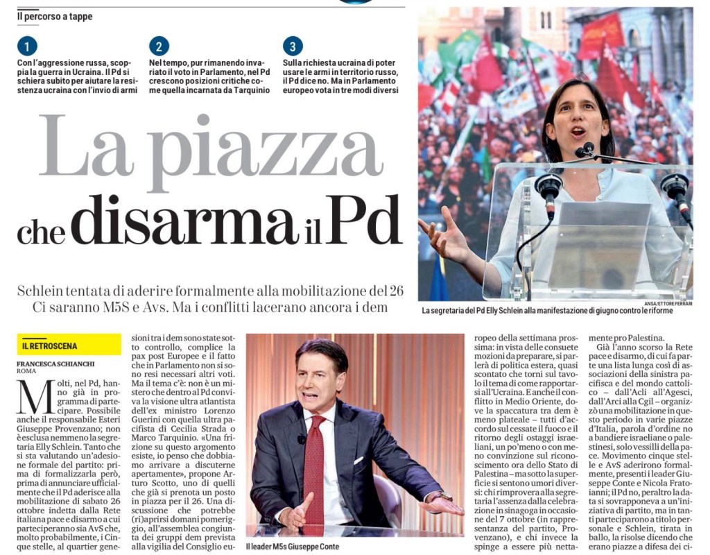 Già l’anno scorso la Rete pace e disarmo, di cui fa parte una lista lunga così di associazioni della sinistra pacifisca e del mondo cattolico – dall’Acli all’Agesci, dall’Arci alla Cgil – organizzò una mobilitazione in questo periodo in varie piazze d’Italia, parola d’ordine no a bandiere israeliane o palestinesi, solo vessilli della pace. Movimento cinque stelle e AvS aderirono formalmente, presenti i leader Giuseppe Conte e Nicola Fratoianni; il Pd no, peraltro la data si sovrapponeva a un’iniziativa di partito, ma in tanti parteciparono a titolo personale e Schlein, tirata in ballo, la risolse dicendo che erano piazze a difesa dei civili «e anche il Pd sta insistendo per la difesa di tutti i civili».