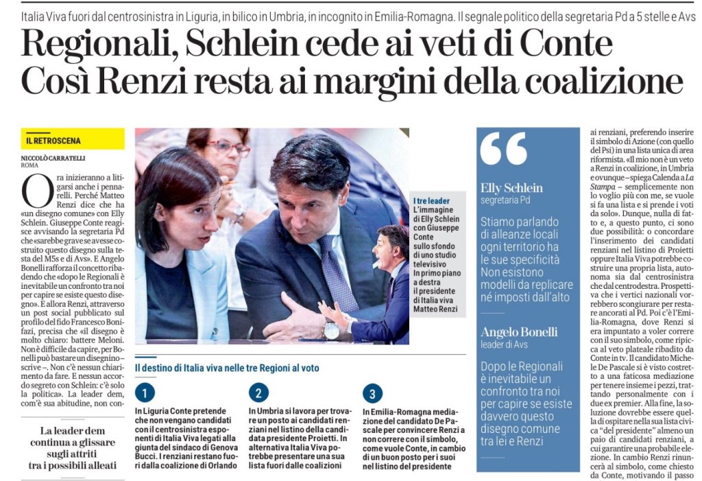 Ma, a voler leggere i segnali politici, una risposta a Conte, Fratoianni e Bonelli la segretaria l’ha già data, suo malgrado. È contenuta nelle coalizioni costruite nelle tre regioni al voto. Schlein aveva detto «basta veti, noi non ne mettiamo, ma non siamo disposti a subirne». Ebbene, pronti, via e a Genova Italia Viva viene fatta fuori dall’alleanza di centrosinistra proprio per il veto messo dai 5 stelle e condiviso dai Verdi-Sinistra. Prima sembrava che Renzi potesse inserire dei candidati in una lista civica a sostegno di Andrea Orlando, senza esporre il proprio simbolo, poi nemmeno quello: troppo compromessi con la giunta del sindaco Bucci. Alla fine, renziani fuori dai giochi, senza i numeri per fare una lista autonoma, formalmente non partecipano alle elezioni liguri.