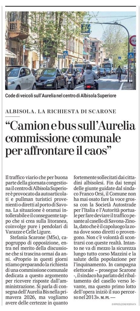 Stefania Scarone (M5s), capogruppo di opposizione, entra nel merito della discussione che si trascina ormai da anni. «Proprio in questi giorni stiamo preparando la richiesta di una commissione comunale dedicata a questo argomento per ricevere risposte dall’amministrazione. Si parla di consegna dell’Aurelia Bis nella primavera 2026, ma vogliamo avere delle certezze in quanto fortemente sollecitati dai cittadini albisolesi. Fin dai tempi delle giunte guidate dal sindaco Franco Orsi, il Comune non ha mai osato fare la voce grossa con la Società Autostrade per l’Italia e l’Autorità portuale per fare deviare il traffico pesante al casello di Savona-Zinola, dato che è il capoluogo la zona dove sono diretti o provengono. Non c’è volontà di scontrarsi con queste realtà. Intanto ne va di mezzo la sicurezza lungo tutto corso Mazzini e la salute della popolazione per l’inquinamento. In campagna elettorale – prosegue Scarone -, il sindaco ha parlato del ribaltamento del casello verso levante, ma questo primo lotto dell’opera iniziò il suo percorso nel 2013». M. PI. —