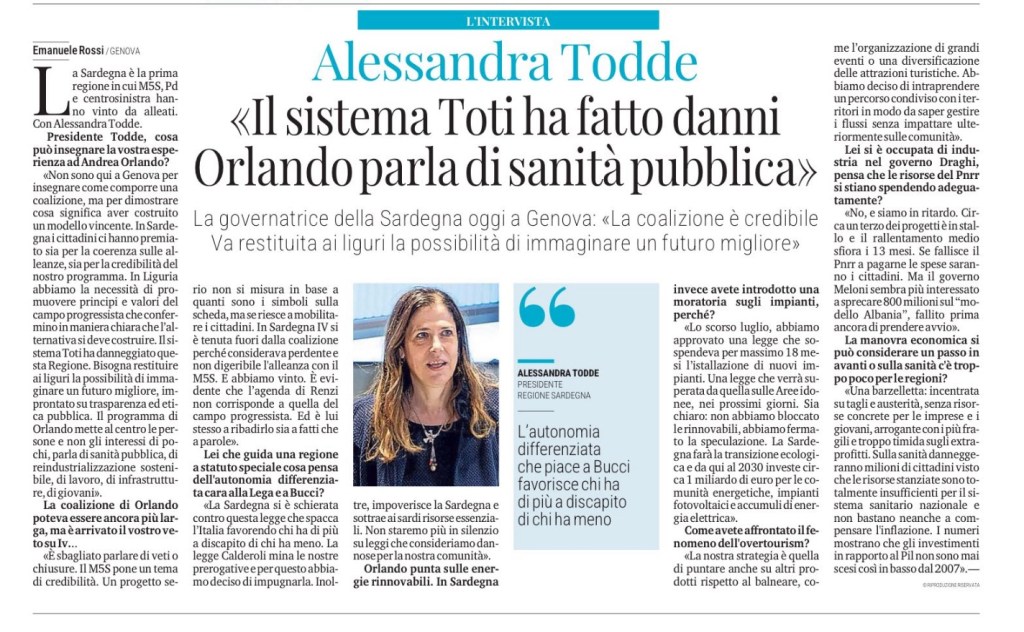 «Non sono qui a Genova per insegnare come comporre una coalizione, ma per dimostrare cosa significa aver costruito un modello vincente. In Sardegna ci hanno premiato sia per la coerenza sulle alleanze, sia per la credibilità del nostro programma. In Liguria abbiamo la necessità di promuovere principi e valori del campo progressista che confermino in maniera chiara che l’alternativa esiste ed è costruttiva. Il sistema Toti ha danneggiato questa Regione. Bisogna restituire ai liguri la possibilità di immaginare un futuro migliore, improntato su trasparenza ed etica pubblica. Il programma di Orlando mette al centro le persone e non gli interessi di pochi, parla di sanità pubblica, di reindustrializzazione sostenibile, di lavoro, di infrastrutture, di giovani.»
