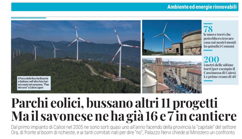 C’è chi la definisce una svolta verde per superare la stagione dell’energia prodotta da fonti inquinanti, ma anche chi parla di “assalto energetico”. Un vento nuovo soffia sul Savonese che, dopo Sardegna e Puglia, sembra esser diventato la nuova terra-calamita per l’eolico. Sono ben 11 i parchi che vorrebbero trovare casa sulle nostre colline, per un totale di 58 nuove torri pronte a roteare per produrre 293 Mw di energia. C’è chi lancia l’allarme per un orizzonte caratterizzato da ogni cucuzzolo costellato da nuove torri bianche, pronte a sommarsi ai 16 parchi già esistenti (48 aerogeneratori in funzione) a fronte di 22 totali in Liguria . Il conto si allunga con altri 7 che sono in costruzione e 2 in stand by, ossia con il via libera già rilasciato, senza però che i cantieri siano stati aperti.
