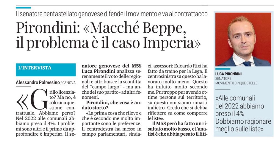 «Grillo licenziato? Ma no, è solo una questione contrattuale. Abbiamo perso? Nel 2022 alle comunali abbiamo preso il 4%. I problemi sono altri e il primo da approfondire è Imperia». Il senatore genovese del M5S Luca Pirondini analizza serenamente il voto delle regionali e attribuisce la sconfitta del “campo largo” – ma anche del suo partito – ad altri fenomeni.
