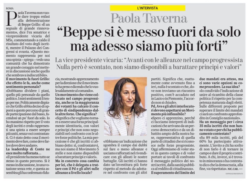“Beppe si è messo fuori da solo ma adesso siamo più forti” Paola Taverna